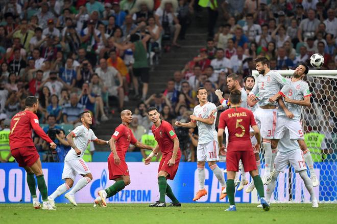 2018年6月15日,世界杯小组赛B组首轮,葡萄牙3-3西班牙。第87分钟,C罗直接任意球破门上演帽子戏法,帮助葡萄牙3-3绝平。此球观赏度极高且价值连城,被解说员盛赞为“翩若惊鸿,宛若游龙”。