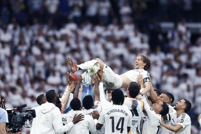 2025年5月24日,西甲第38轮,皇马2-0皇家社会,莫德里奇完成了在伯纳乌主场的告别战,皇马球员将魔笛高高举起。在13年皇马生涯的597场比赛里,魔笛赢得了28座奖杯,成为皇马队史冠军最多的球员。